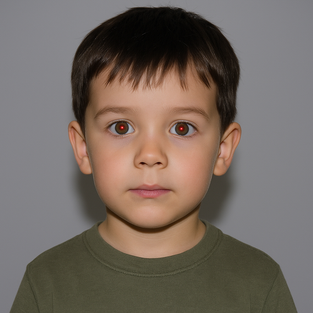 이를 구별하는 간단한 방법은 플래시를 켜고 정면 사진을 찍는 것입니다. 사진에서 양쪽 눈동자 중앙에 플래시 반사가 같은 위치에 있다면 대부분 정상입니다. 그러나 반사점이 눈의 중심에서 벗어나 있다면 사시일 가능성이 있으므로 안과 검진이 필요합니다.